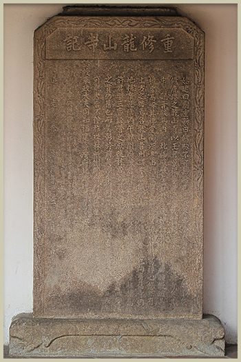欲了解一座廟宇的歷史, 碑文是最佳的史料來源。道光十一年(一八三一)「重修龍山寺記」碑文為北路理番鹿港海防同知王蘭佩所撰,內容即說明了鹿港龍山寺的遷建、重修的過程。由碑記的內容得知鹿港龍山寺為溫陵(泉州安海)龍山寺的分寺,於乾隆五十一年遷建至今日現址。碑文內容所敘述的人物背景,說明如下: