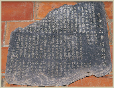 另一石碑於民國七十五年十月重修時發現,目前由寺方保管,碑文內容記載:「特授鹿港理番海防分府王(蘭佩)捐銀四十員,署鹿港理番海防分府張(縉雲)捐銀五十員…」,龍山寺重修時張縉雲已調往嘉義當知縣。鹿港商賈泉、廈等八郊及地方士紳的捐銀,為重修龍山寺工程經費最大的來源。「泉廈郊商船戶捐題緣金碑」其中三塊碑現嵌於龍山寺右廂廊牆面,此碑的材質為烏晶石碑,質地細膩堅硬,適合用於細字體碑文的陰刻,此碑文雖未落款由何石店商號所鐫琢,但經查台灣中部碑文,從嘉慶至道光年間以烏晶石所刻之碑文,均出自「泉郡觀東石室居」所刻,此一資料提供參酌。
