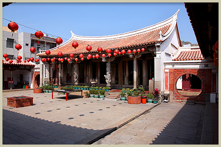 ]後殿的門屏為鹿港木雕李煥美、李松林等匠師所雕刻,門屏設計頗為實用,每個門扇皆可開啟,當寺方舉行慶典時,開敞的門屏方便信士的進出。前步口有一對龍柱,為蔣馨的女婿張金山所承製,龍柱造型為日治時期的風格,當時因航運不便,所以採用台灣的觀音石。後殿前步口開有二扇拱門與兩廂房聯接。日治時期,此廂房為日本住持居住的空間。