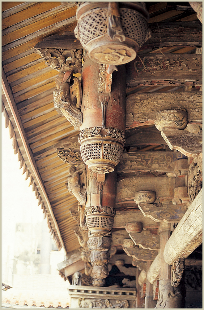五門殿前簷下方有一排吊筒,雕刻有各式各樣的花籃造型,其上裝飾有古錢或蓮花,吊筒的正面並裝飾有飛天、鳳凰及三腳蟾蜍等木雕,造型優雅樸實,吊筒後方的斗栱則採碗型的斗及關刀型的栱,為泉州溪底匠派所擅長的做法。樑架上的獅座及枋木的雕刻樸拙,為泉州匠師的作品。