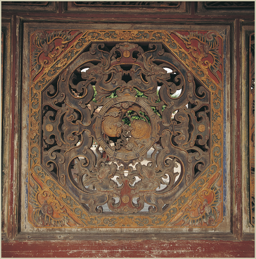 五門殿正面兩側有夔龍窗木雕,其圖案源自於《易經》〈繫辭傳〉:「易有太極,是生兩儀,兩儀生四象,四象生八卦」,兩儀代表陰儀與陽儀,四象為四方之象,即春夏秋冬,木雕的圖案中分別以兩隻鯉魚及四隻夔龍來表達,又象徵「鯉魚躍龍門」,有祈求「登科取士,金榜高中」之意。