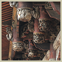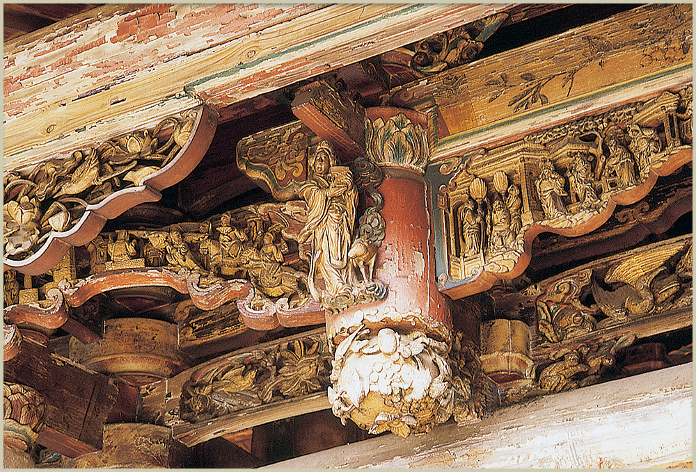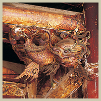 拜殿壽樑與木柱交角的地方,有一對龍頭魚尾造型的木雕,為龍生九子中的「螭吻」,「螭吻」性好吐水,裝飾在建築物上,有防火災的喻意。文人視此龍頭魚尾的造型為鰲魚,有「獨佔鰲頭、科舉高中」的意涵。由於龍身雕有翅膀,鹿港匠師稱之為「飛魚」。