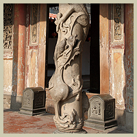 龍柱柱身高二六十公分,直徑三十公分,柱身與柱珠接縫處置有墊片,為當年匠師調整柱身穩定平衡之用。龍柱的柱珠採圓形青斗石雕刻,柱珠上雕有花鳥瑞獸等吉祥圖案,柱珠及磉石採獨立分開,有別於山門一體成型的柱珠柱礎。
