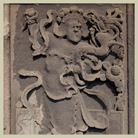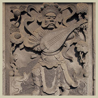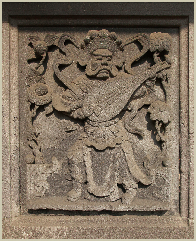 四大天王 石雕五門殿兩旁的龍虎翼廊可以欣賞到「四大天王」石雕。四大天王為古印度須彌山的四大護法,民間俗稱「四大金剛」。佛經中的四大天王分別為東方「持國天王」手執琵琶,「持國」之意為慈悲為懷,保護眾生,是為樂神,以音樂感化眾生皈依佛教。南方「增長天王」手執寶劍,「增長」指能傳令眾生,具增長善根,護持佛法之意。西方「廣目天王」手持小龍,「廣目」意為能以淨天眼觀察世界,護持人民。北方「多聞天王」手持寶傘,「多聞」比喻福德之名聞於四方,其手持寶傘用以制服魔眾,保護人民財富。