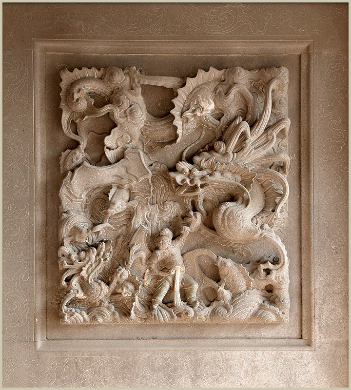 五門殿兩旁的龍、虎堵石雕,均採深浮雕方式,龍堵的石雕構圖中,龍在空中騰雲駕霧,下方雕飾有二隻鯉魚,並以岩石做成禹門的造型,象徵「魚躍龍門」。雲龍的下方有一人物做降龍狀,即佛教十八羅漢中的「降龍尊者」,其衣服著有青色的顏料,也符合了五行的色彩。虎堵的石雕,老虎由山稜縱躍而下,回首凝視身邊的小老虎,旁邊的松樹隨風搖曳,有「虎嘯生風」之勢,而在左上方有一人物做伏虎狀,此人為「伏虎尊者」。佛教原有十六羅漢,在漢化後,再加上降龍與伏虎羅漢,是為十八羅漢。