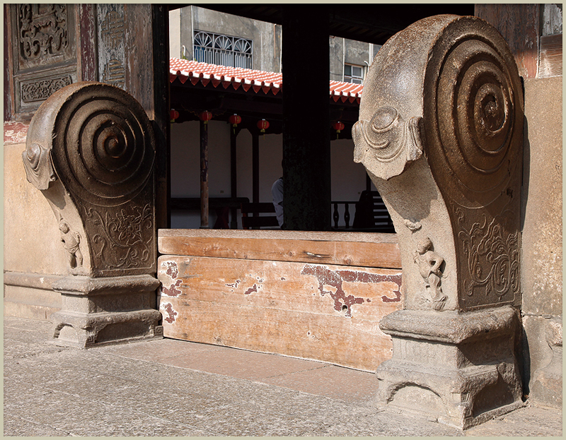 五門殿次間門前的石箱,又稱「石門枕」,其功能與石鼓相同。石箱所使用的材質為福建惠安縣玉昌湖的青斗石,此種石材質地細密,紋理清晰,呈現墨綠色澤,為閩南地區上等的石材。龍邊次間的石箱正面刻有「龍馬負河圖、神龜背洛書」虎邊次間的石箱正面刻有「香花燈果」,石箱的側面則雕刻有硬團螭虎、軟團螭虎及鶴啣靈芝等吉祥圖案,是龍山寺石雕藝術的經典之作。