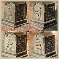 五門殿身堵的博古石雕採深浮雕,分別代表「香、花、燈(茶)、果」,為禮佛時的四種基本物品。龍邊博古圖騰中香爐的左上方有一隻蝙蝠,象徵「福」,左下角有一顆桃子,象徵「壽」,香爐取其諧音為「祿」,整體造型象徵「福祿壽」。香爐的爐蓋有一隻動物,名為「狻猊」,其性好煙,故置於香爐上,是龍生九子之一。博古架上燈座上掛有龍頭魚尾的燈籠造型,象徵「獨佔鰲頭」。虎邊的博古圖騰雕刻牡丹、花瓶及案桌,代表「富貴平安」,旁邊有「南瓜、石榴、佛手柑」,代表「多子多孫多福」之意。