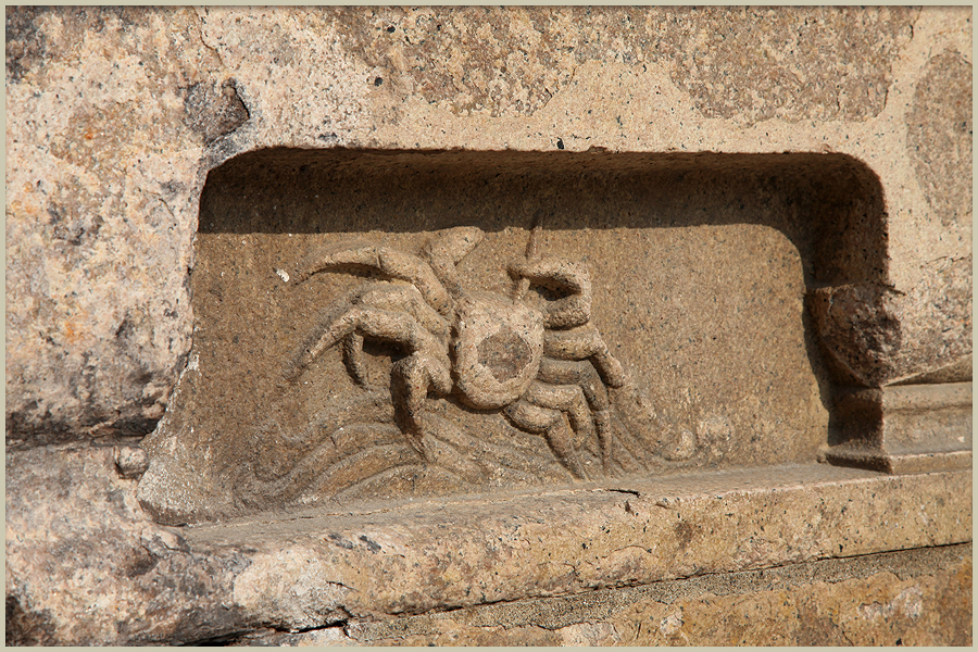 馬櫃台裝飾是龍山寺建築基座的特色之一,五門殿兩旁磚柱下方馬櫃台的石雕,更具風格。龍邊雕飾民間所傳說的「三腳蟾蜍」,圖中蟾蜍口吐一團雲煙,隱約可看到一座宮殿的型廓,代表「蟾宮」,古人即以「蟾宮」代表月宮,「登蟾宮」即有「金榜題名」之意。虎邊則雕飾螃蟹,螃蟹的前螯鉗住一支筆,古人以螃蟹代表「科甲高中」的涵意,最外側的馬櫃台腳下的石雕為香爐,則代表「香火綿延」。