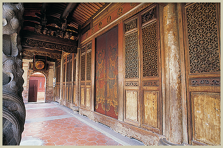 ]後殿的門屏為鹿港木雕李煥美、李松林等匠師所雕刻,門屏設計頗為實用,每個門扇皆可開啟,當寺方舉行慶典時,開敞的門屏方便信士的進出。前步口有一對龍柱,為蔣馨的女婿張金山所承製,龍柱造型為日治時期的風格,當時因航運不便,所以採用台灣的觀音石。後殿前步口開有二扇拱門與兩廂房聯接。日治時期,此廂房為日本住持居住的空間。