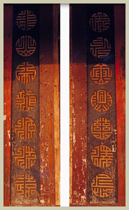 五門殿正門兩旁有一幅木刻對聯,採「圓篆體」雕刻,其上書: