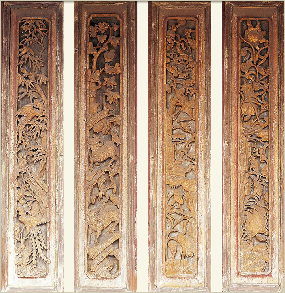 龍山寺次間的門旁木雕,則有代表四靈的「鳳麟鶴龜」作品,鳳與麟皆為祥瑞的動物,鶴與龜為長壽的動物,有「祥瑞長壽」之意。五門殿正門的兩旁有「螭虎團爐」的木雕作品,其頂板處「博古花卉」的木雕作品,雅緻的構圖及精采的雕刻深受鹿港木雕匠師所推崇。