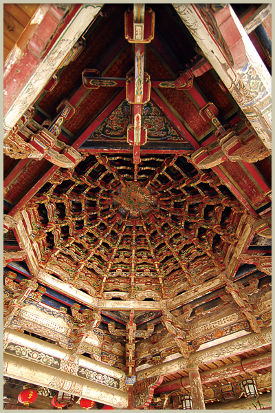 藻井是建築物頂棚中最尊貴的作法,除了能塑造室內富麗堂皇的效果,更具有隔斷過高的空間以保持室溫及避免灰塵下落的功能。早期的藻井為方井,至遼、宋、金時期,藻井出現了「斗八藻井」,形狀成八角造型,由斗栱支撐,逐層向上縮小,形成穹窿式的造形。「藻井」,台灣的匠師稱為「蜘蛛結網」。