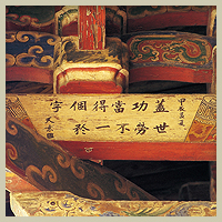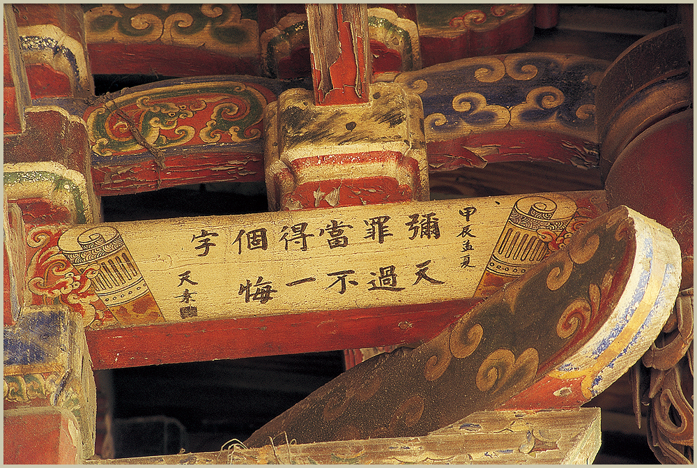 八卦藻井彩繪 戲台八卦藻井內的彩繪是郭新林在民國五十三年所完成的作品,壽樑上可見郭新林的親筆落款,垛頭的藻飾點綴著八卦藻井,更顯得富麗堂皇,枋心內有鹿港名書法家黃天素的字跡,其上書: