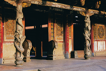 龍柱柱身高二六十公分,直徑三十公分,柱身與柱珠接縫處置有墊片,為當年匠師調整柱身穩定平衡之用。龍柱的柱珠採圓形青斗石雕刻,柱珠上雕有花鳥瑞獸等吉祥圖案,柱珠及磉石採獨立分開,有別於山門一體成型的柱珠柱礎。