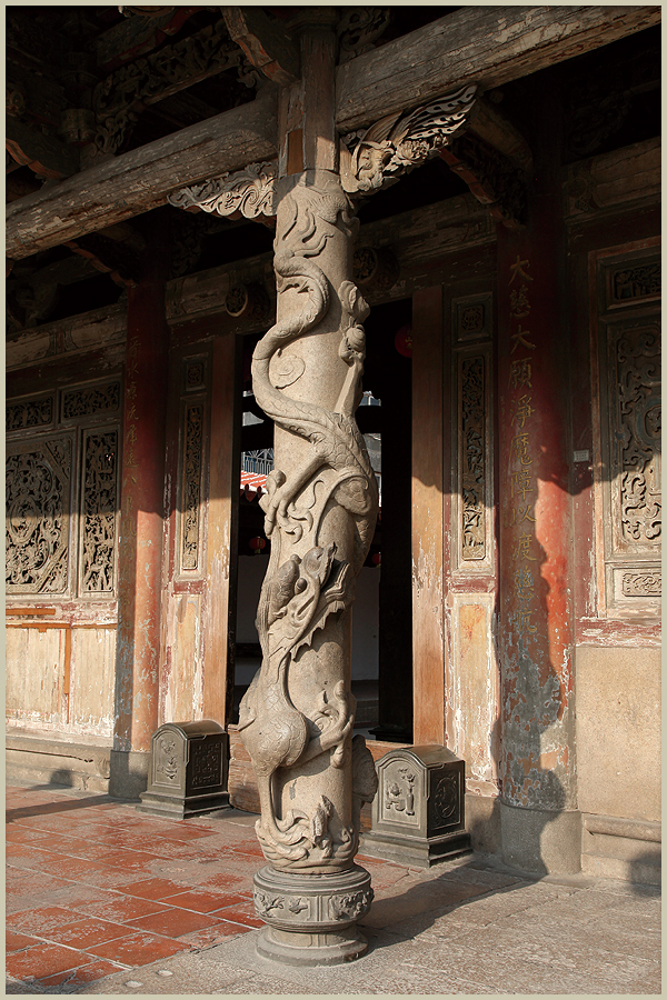 這對龍柱造型為龍邊龍身由上往下隨雲臨降,虎邊龍身由下向上翻騰,《易經》的概念中,乾為天、為陽、為上、為父,坤為地、為陰、為下、為母,這種一上一下的龍柱造型,稱為「乾坤交泰」,象徵「天地之氣交和,萬物生生不息」之意。台灣現僅有兩對此種造形的古石雕龍柱,另一對在屏東內埔天后宮的前殿。