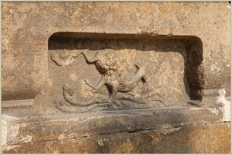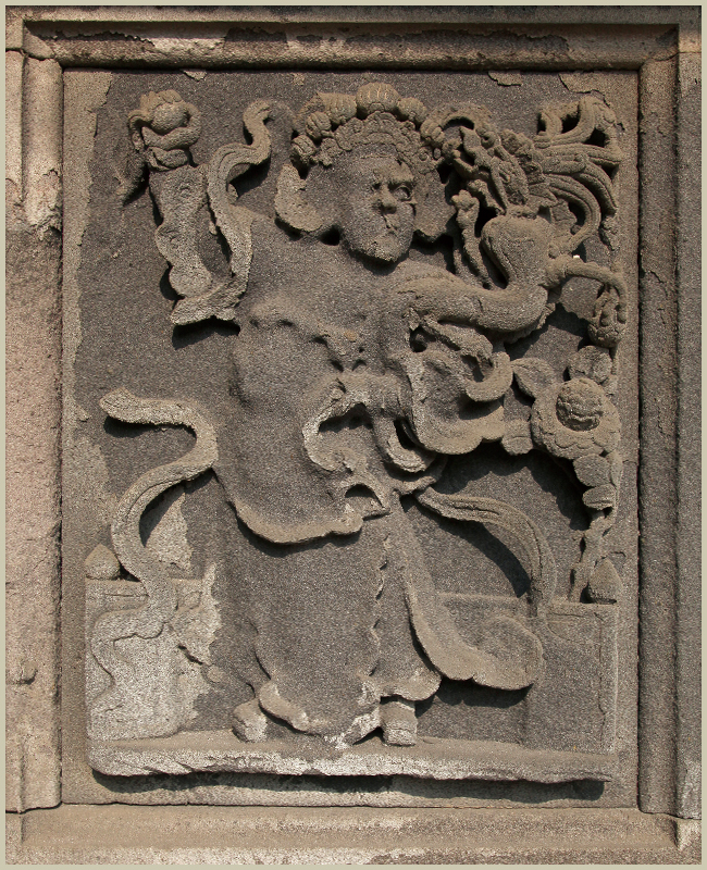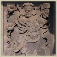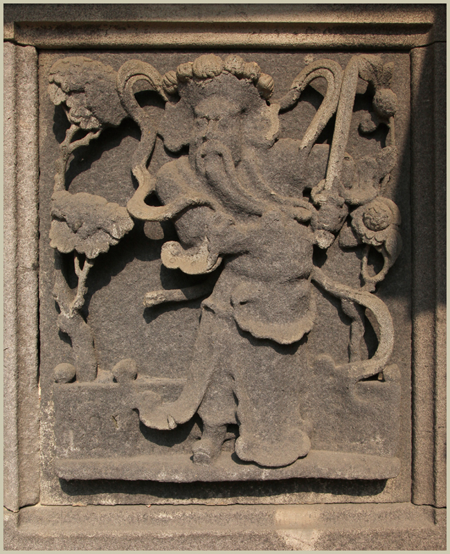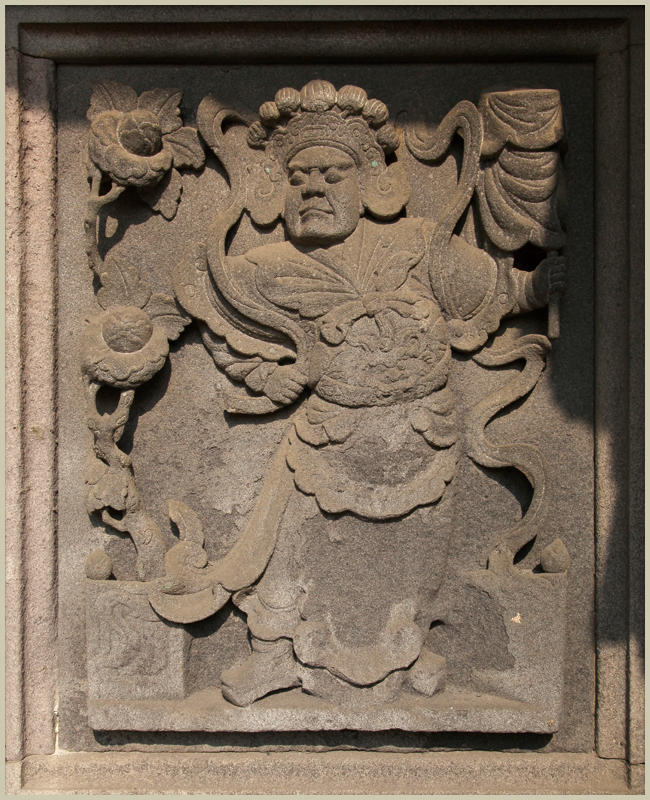 四大天王 石雕五門殿兩旁的龍虎翼廊可以欣賞到「四大天王」石雕。四大天王為古印度須彌山的四大護法,民間俗稱「四大金剛」。佛經中的四大天王分別為東方「持國天王」手執琵琶,「持國」之意為慈悲為懷,保護眾生,是為樂神,以音樂感化眾生皈依佛教。南方「增長天王」手執寶劍,「增長」指能傳令眾生,具增長善根,護持佛法之意。西方「廣目天王」手持小龍,「廣目」意為能以淨天眼觀察世界,護持人民。北方「多聞天王」手持寶傘,「多聞」比喻福德之名聞於四方,其手持寶傘用以制服魔眾,保護人民財富。