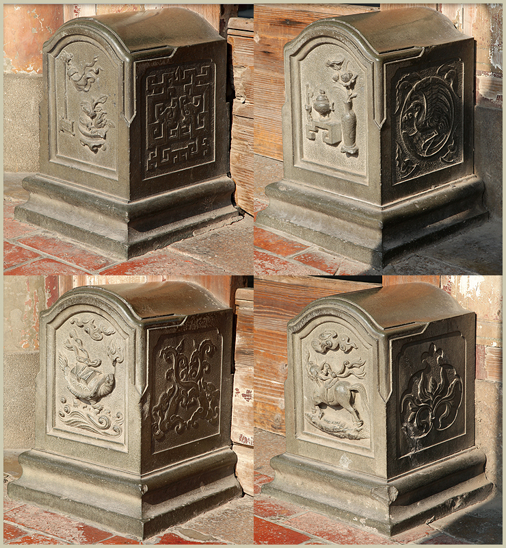 五門殿身堵的博古石雕採深浮雕,分別代表「香、花、燈(茶)、果」,為禮佛時的四種基本物品。龍邊博古圖騰中香爐的左上方有一隻蝙蝠,象徵「福」,左下角有一顆桃子,象徵「壽」,香爐取其諧音為「祿」,整體造型象徵「福祿壽」。香爐的爐蓋有一隻動物,名為「狻猊」,其性好煙,故置於香爐上,是龍生九子之一。博古架上燈座上掛有龍頭魚尾的燈籠造型,象徵「獨佔鰲頭」。虎邊的博古圖騰雕刻牡丹、花瓶及案桌,代表「富貴平安」,旁邊有「南瓜、石榴、佛手柑」,代表「多子多孫多福」之意。