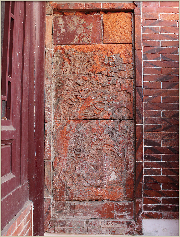 龍山寺兩側川廊自五門殿、正殿、後殿分別為拱門、八卦門及圓門,不同型式的門扇,不僅增加空間設計的變化,也讓民眾置身其中,心隨境轉。後殿圓門的後方,有龍山寺僅存的磚雕作品。穿過後殿兩側圓門,即為早年住持起居的地方。龍邊廂房內的木屏壁堵上,保存有歷史悠久的書法墨跡,其上書: