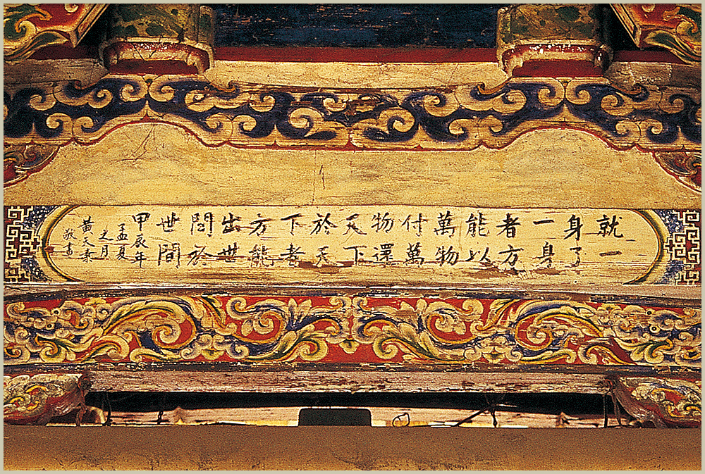 黃天素,字絢章,生於明治四十年(一九○七),幼時曾向前清秀才鄭鴻猷、施少雨請益書法,工人物、花鳥,書法鐘愛魏碑漢隸。民國四十七年至天后宮繪製「李鐵拐 福在眼前」壁畫,民國四十八年至五十三年受新林師之邀至龍山寺正殿、拜殿及五門殿現場揮毫。民國八十五年逝世,享壽九十歲。
