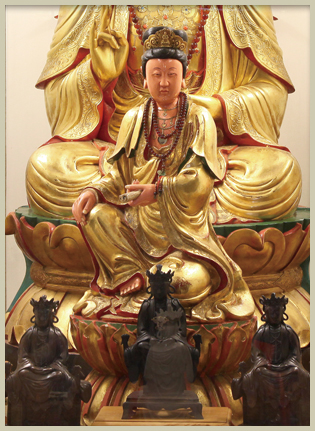 鹿港龍山寺正殿主祀佛教觀音菩薩,配祀韋馱、伽藍尊者為二大護法。佛教漢化後,尊四大菩薩分別為觀音菩薩表「大悲」,文殊菩薩表「大智」,普賢菩薩表「大行」,地藏菩薩表「大願」。其中觀音菩薩的信仰普及於世俗,觀音又譯做「觀自在」、「觀世音自在」,唐代因避太宗李世民之諱,省去「世」字,簡稱「觀音」,延用至今。觀音即「觀自在」,一是表示大智慧,能自在的觀察事理,二是表示大慈悲,尋聲救苦,從心所欲,了無障礙。